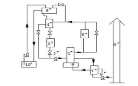 焦化廠采用的導(dǎo)熱油爐可以高爐煤氣為燃料,以導(dǎo)熱油為熱載體,通過熱油泵強制循環(huán),將熱量傳遞給各塔加熱設(shè)備?! 」に嚵鞒倘鐖D1所示。熱載體導(dǎo)熱油用熱油泵2#送入導(dǎo)熱油爐1#,經(jīng)導(dǎo)熱油爐加熱到220~240℃后,再送入蒸餾塔加熱器5#進行加熱,此時導(dǎo)熱油溫度降為200℃。導(dǎo)熱油再經(jīng)4#氣液分離器、3#過濾器后,回到熱油泵進口,這樣就形成了加熱利用——再加熱再利用的閉路循環(huán)系統(tǒng)。10#貯油槽、6#膨脹槽的作用是及時補充循環(huán)系統(tǒng)中損失的導(dǎo)熱油。在導(dǎo)熱油爐內(nèi)高爐煤氣燃燒后產(chǎn)生的廢氣,經(jīng)7#高爐煤氣換熱后,降至250℃以下,用8#引風(fēng)機經(jīng)9#煙囪排出。高爐煤氣經(jīng)換熱后由30℃升高到180℃。